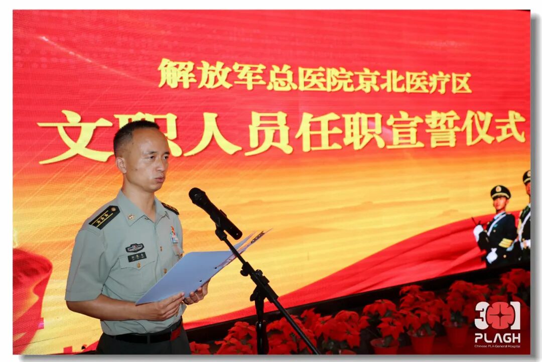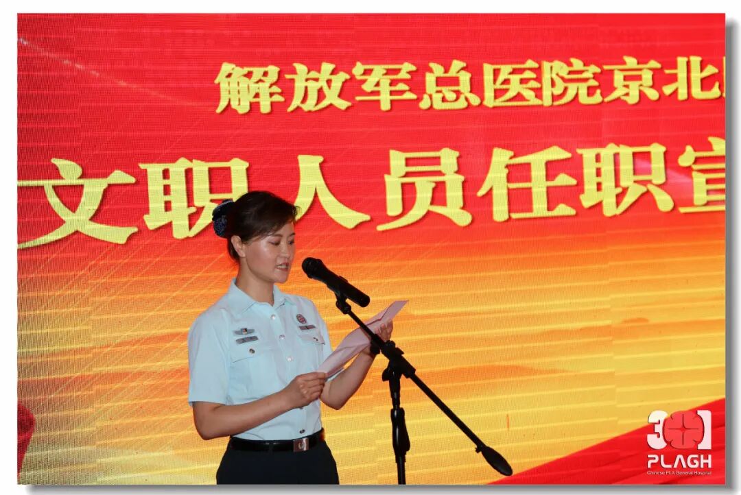 仪式在雄壮的国歌声中拉开帷幕,刘聚伟主任宣读了首批39名文职人员的任职通知,医疗区领导为文职人员佩戴了标志服饰。身穿崭新制服的新任职文职人员向军旗庄严宣誓。新任职文职人员代表王丽护师作承诺践诺表态发言,表示在全新的岗位上、在今后的工作中要苦学精炼、刻苦专研,为部队战斗力建设添砖加瓦,为身上的“孔雀蓝”增光添彩。